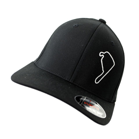 Genuine Flex Fit cap with the Summit Point Main circuit ouitline embroidered in white on the left panel of the front. Black color. Choose from Small-Medium or Large-XL size.